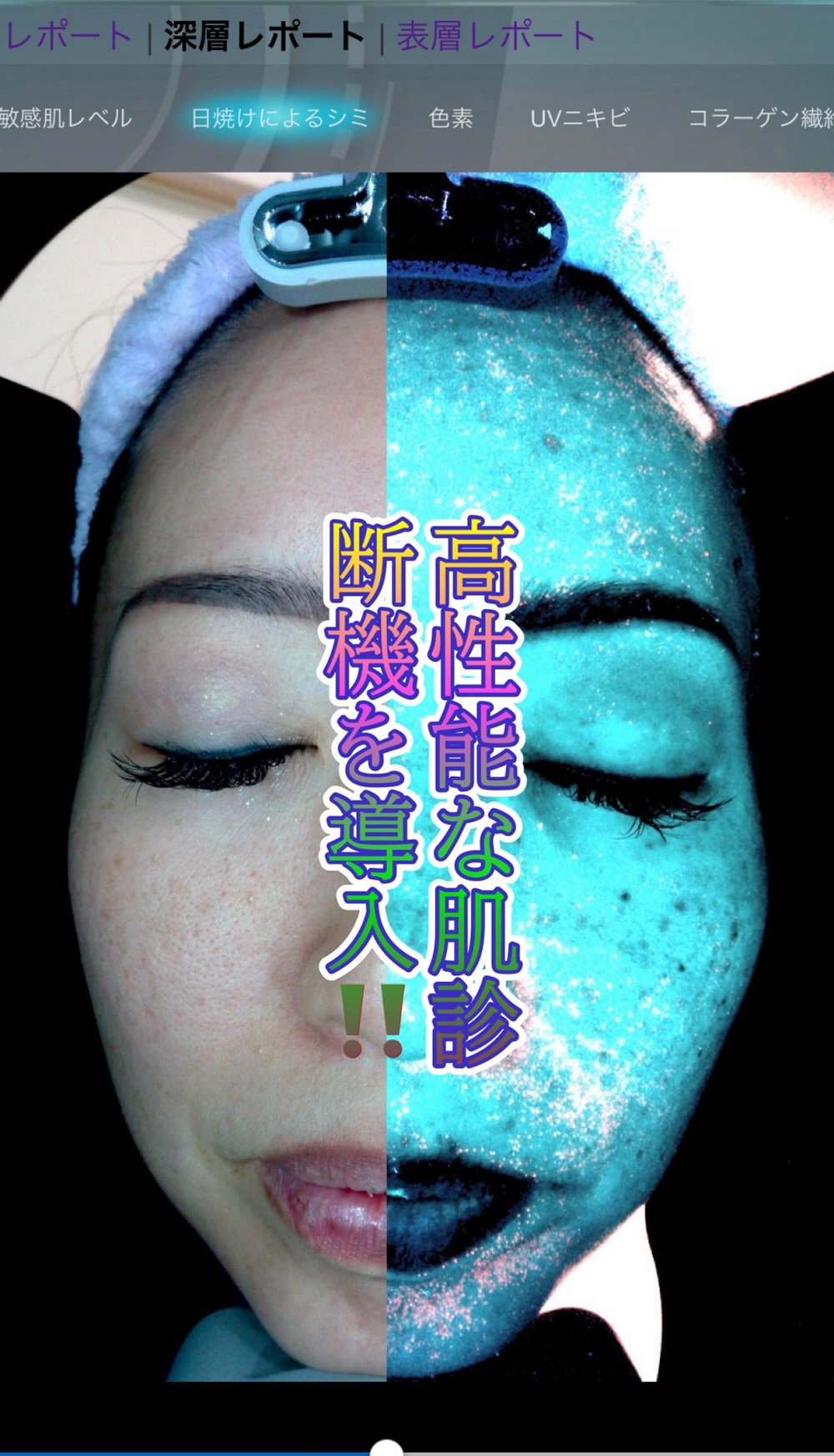 また、肌表面(肌表層)と肌深部(肌深層)の状態はまた違うこともあります。どこまでシミが根強く深層にまであるのか等、調べることができますので、これは発見できたことで、肌がもっと良くなるための対策ケアをしていくことで、モチベーションが上がります。