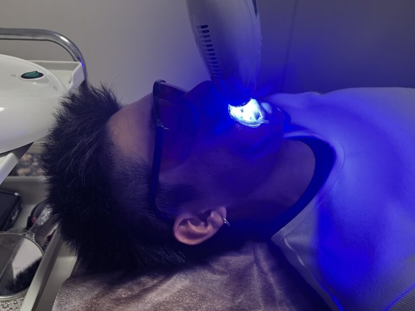 当店のセルフホワイトニングは、LED光の照射と専用のホワイトニングジェルの科学反応である光触媒作用により、歯に付いた汚れやニオイを分解し、さらなる汚れの付着を防ぎます。